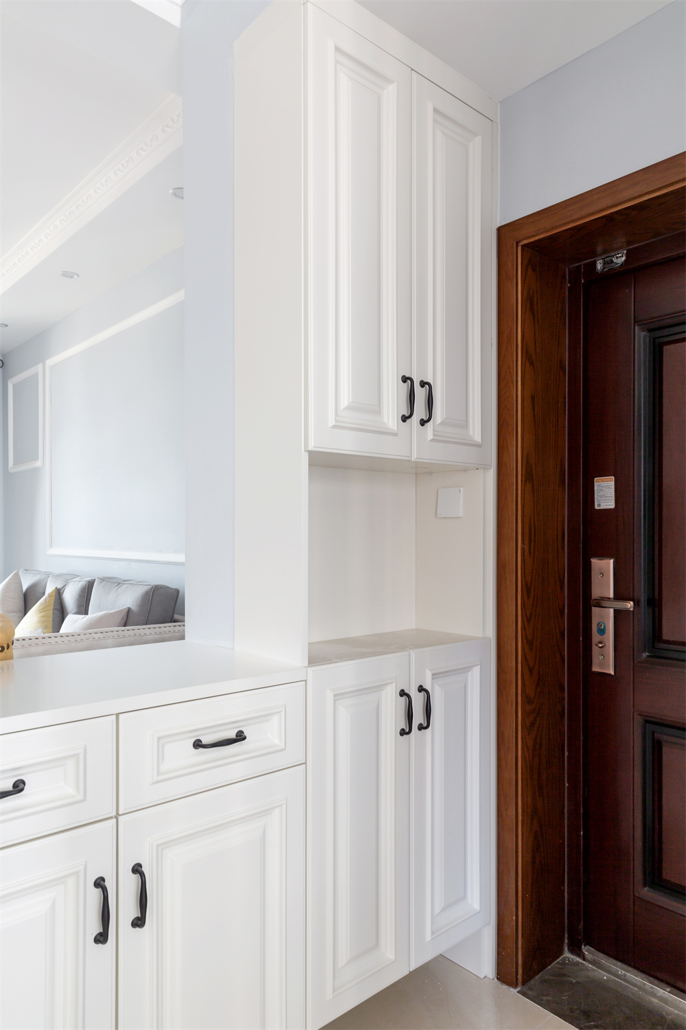 從進門處映入眼簾的是整體芬蘭白的玄關柜,屋主選擇做了L型的玄關柜。延伸出類似于吧臺的設計,在視覺上與客廳處相連接,同時放大玄關處的空間感。