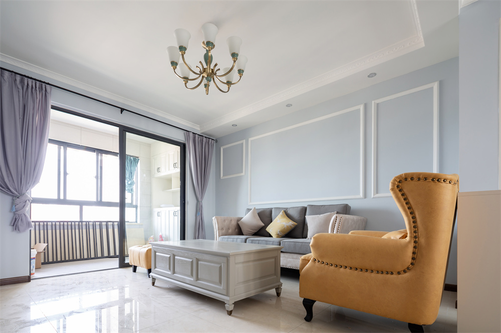 客廳處能夠真正體現(xiàn)出北歐風情。以藍白為主要色調(diào),搭配白色吊燈,在燈光與顏色的搭配下凸顯溫馨的感覺。沙發(fā)背景墻上帶有三個不同大小的長方形的圖案,為客廳處增加生機活力。橘黃色沙發(fā)為客廳處增添一抹亮色,可以很好調(diào)節(jié)客廳內(nèi)的氛圍。
