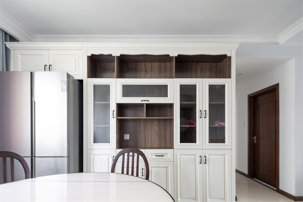 收納柜的頂部做了延長設計,便于冰箱的嵌入式擺放,可以節(jié)省冰箱占據(jù)的空間。白色柜身與中雅胡桃色里面的相互搭配,透露出一股靜謐典雅的感覺。柜身按照不同擺放需求,頂部可以放置許久不用的東西,中間部分放置杯子、書本這種日常隨手可以用的物品,下方可以放置一些榨汁機、暖瓶、燒水壺等物品。
