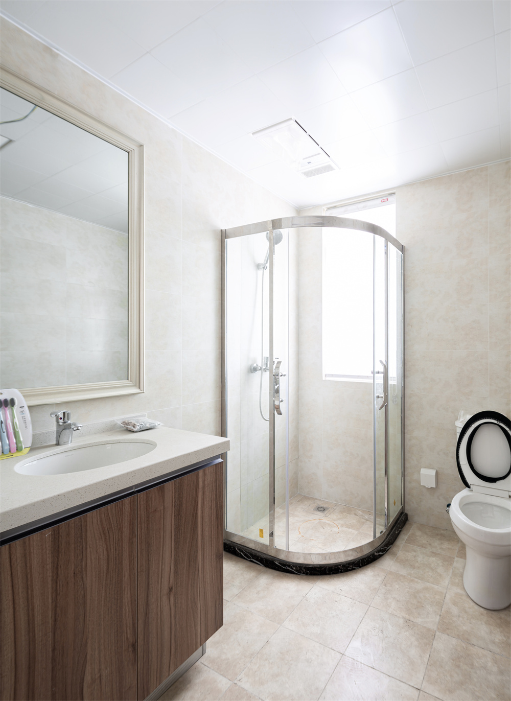 衛(wèi)浴處水池面盆和洗浴間的設計是干濕分離做法的典范,首先洗浴間做了半包的設計,抬腳線高度足夠的高可避免水的漫出,在洗澡之后便可以打開窗戶進行通風散氣。與水池連接的柜體下面留出一些距離,便于日常水汽的散發(fā),且在衛(wèi)浴間內(nèi)沒有多于物品的阻擋,可及時保持墻面和地面的干燥。