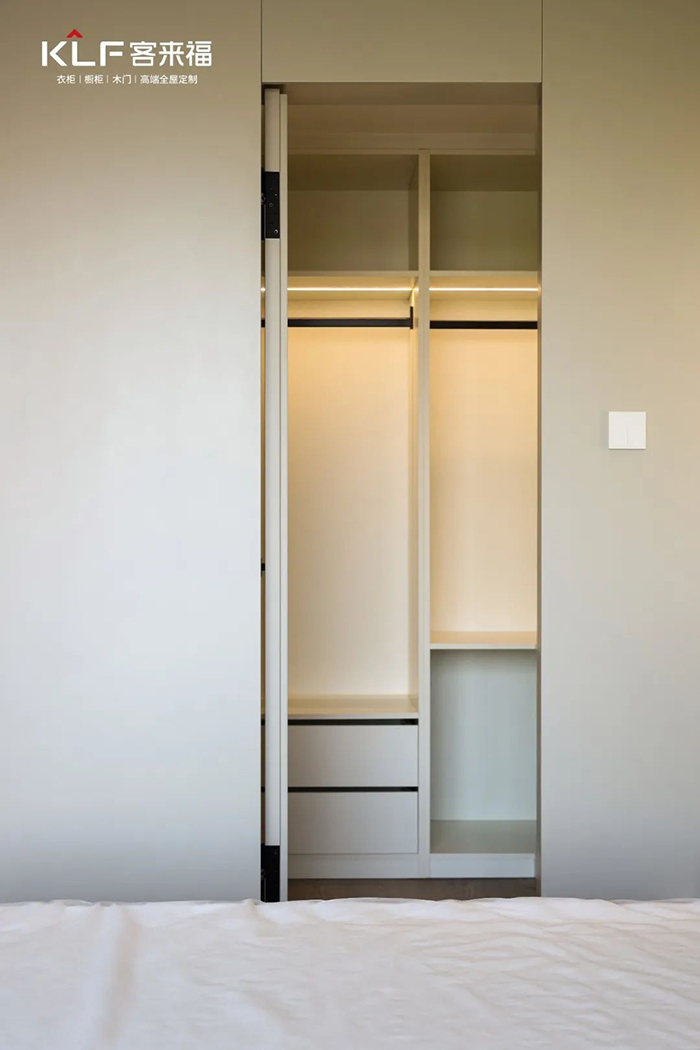 臥室衣柜多采用芬蘭白柜體,簡潔大方,輕松打造出極簡奶油風,搭配定制木作背景墻,手感細膩,高級品味不言而喻。