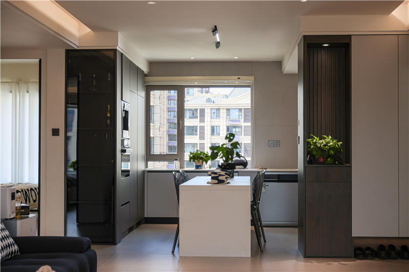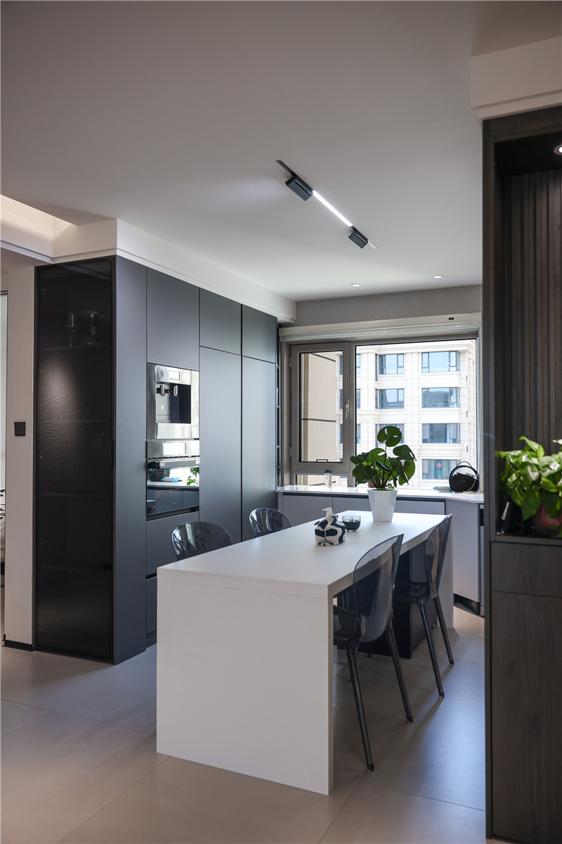 餐廳以白色系餐桌搭配透明餐椅,增添空間時尚感;靠墻一側(cè)做餐邊柜,檀木紋搭配水洗灰,撲面而來的意式極簡風(fēng),內(nèi)嵌家電+免拉手設(shè)計(jì),給人不費(fèi)勁的精致感。