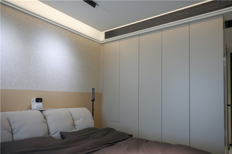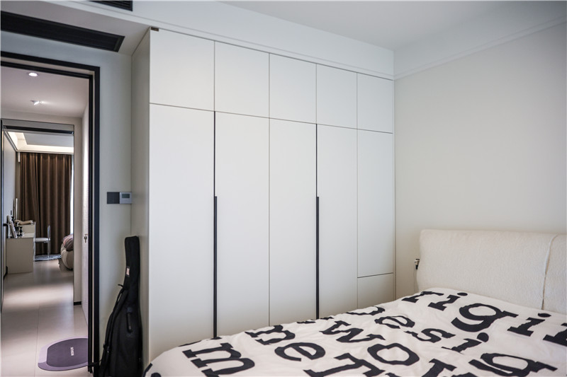 因?yàn)榧依餂]有做衣帽間,所以在主臥中,客來福打造了一面到頂高柜進(jìn)行衣物儲納,茶白的色調(diào)清冷高級,同樣也運(yùn)用在床尾的斗柜上,抽屜造型更便于拿取物品。與斗柜相連,同色系同材質(zhì)的梳妝臺也滿足了居者的生活需求。