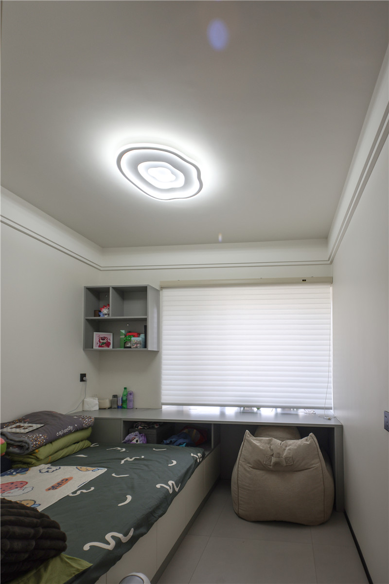 次臥空間與兒童房都在睡眠區(qū)+收納區(qū)的基礎(chǔ)上各自增設(shè)人性化定制的家居產(chǎn)品,例如兒童房中在床尾設(shè)計(jì)的長書桌以及壁掛式收納格,讓整個房間功能更為豐富。