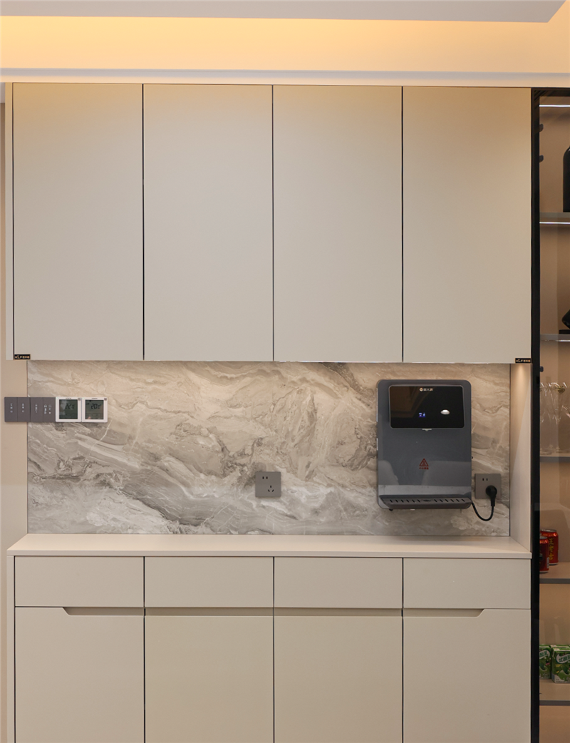 廚房貼墻打造U型深灰色櫥柜,配合茶白頂柜,融入創(chuàng)新水漆工藝,呈現(xiàn)高級美感;常見廚房構(gòu)造,大小戶型都適合;整體光線層次分明,使得空間清晰明朗。