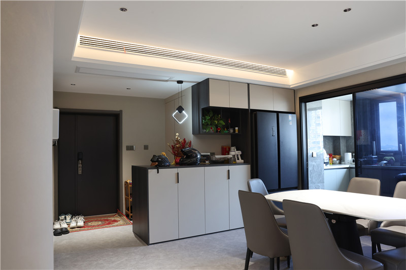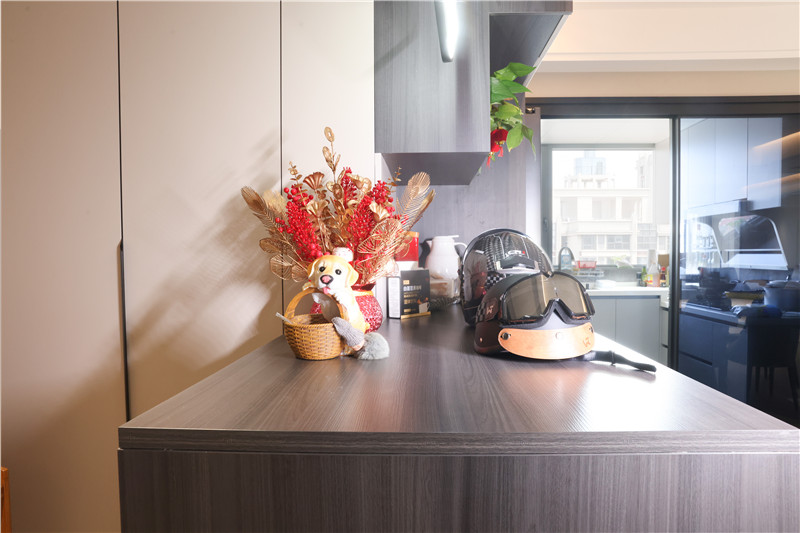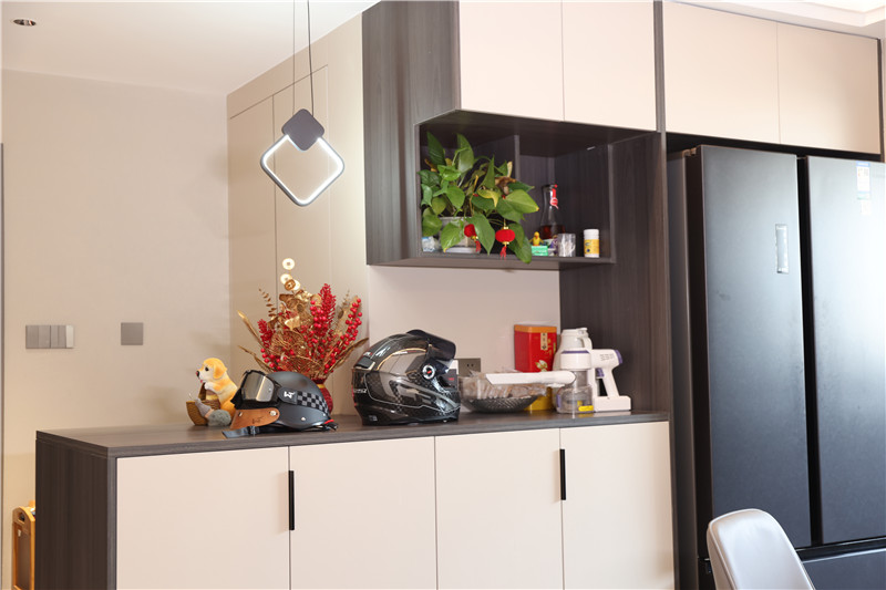 入戶柜L型設(shè)計(jì),選用客來福科技木紋+茶白,百搭自然;柜體設(shè)計(jì)充分利用入戶空間,一邊打一柜到頂式整面墻衣柜,增加收納能力,另一邊中部留空放置裝飾品或日常常用物品,既有顏值又實(shí)用;保證收納同時(shí)還內(nèi)嵌冰箱,為廚房減輕儲(chǔ)物壓力。