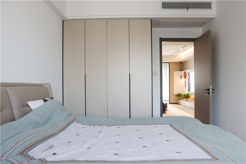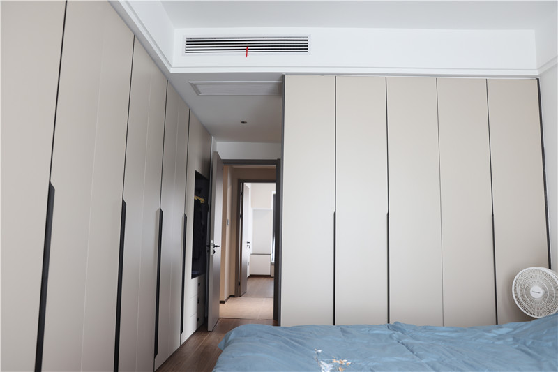 靠墻打一柜到頂式衣柜,選擇一字型長(zhǎng)條拉手,茶白色經(jīng)典熱門,放在臥室舒適自然。