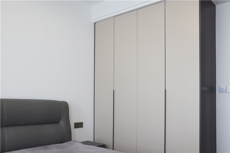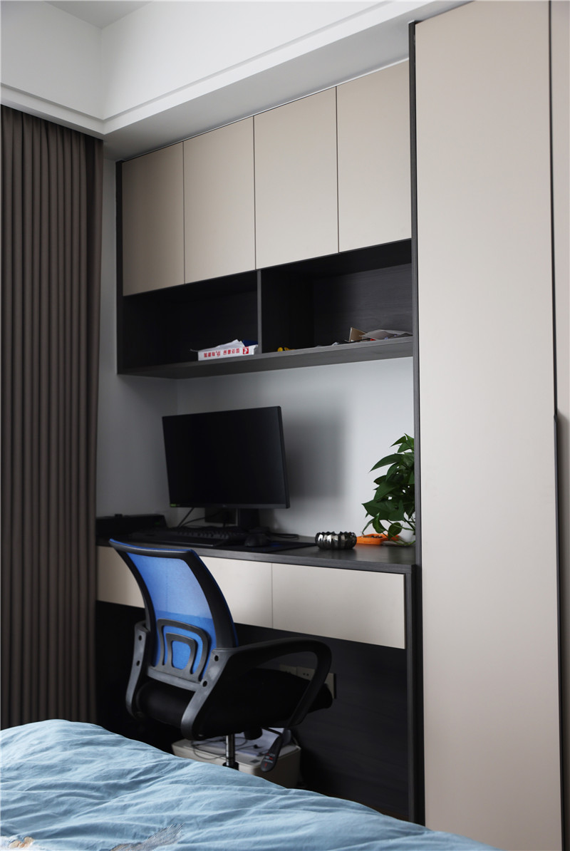 靠墻打一整面一柜到頂式衣柜,將其用作衣帽間+書桌,預(yù)留開放掛衣區(qū),滿足日常使用習(xí)慣;選用一字型長(zhǎng)條拉手,視覺上簡(jiǎn)潔、時(shí)尚。