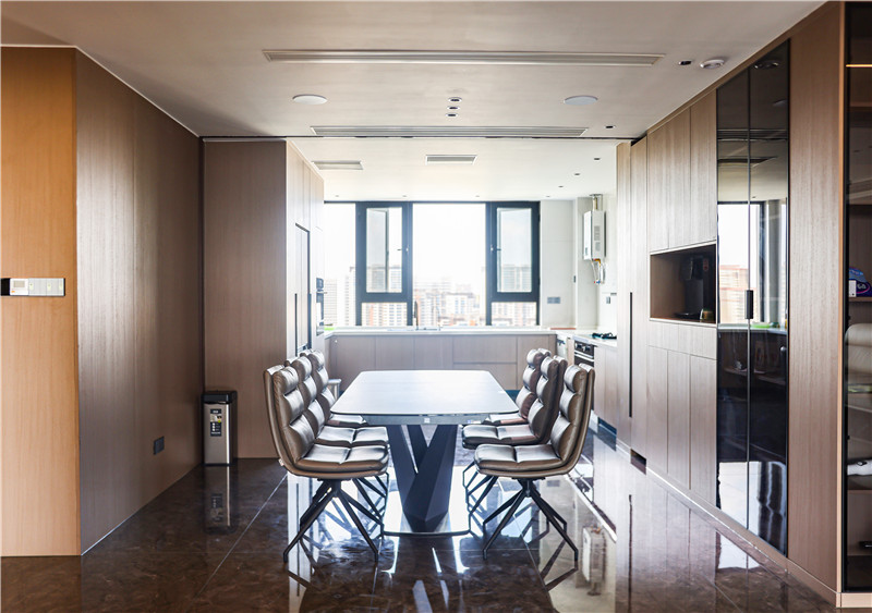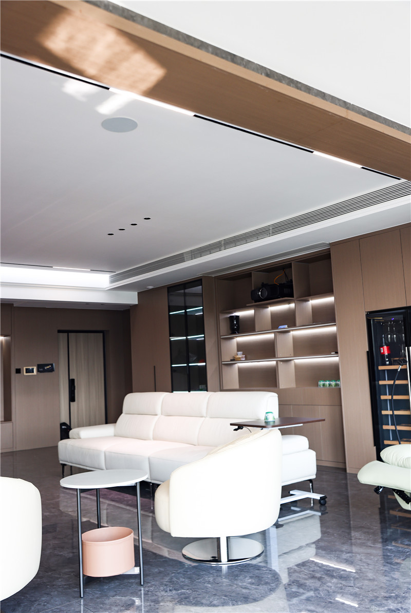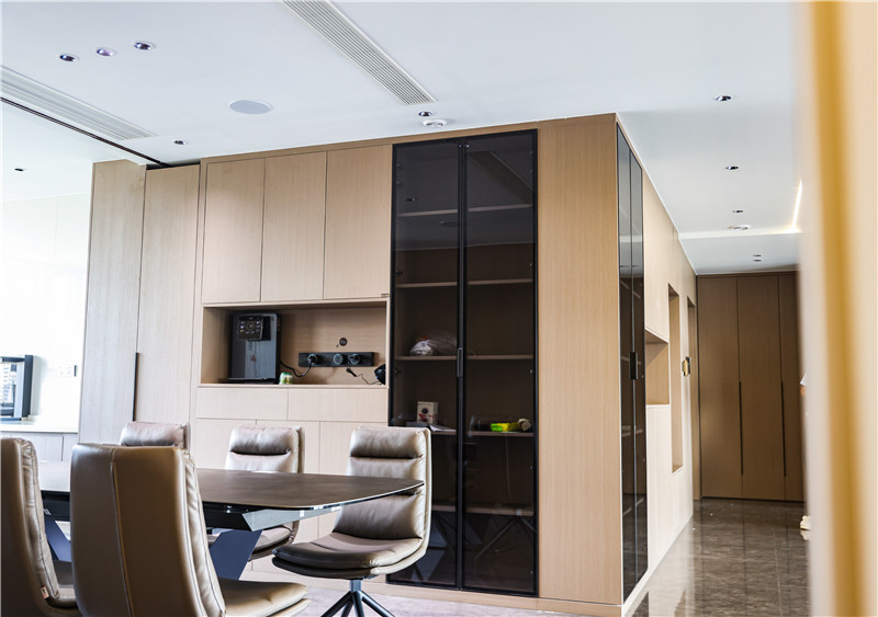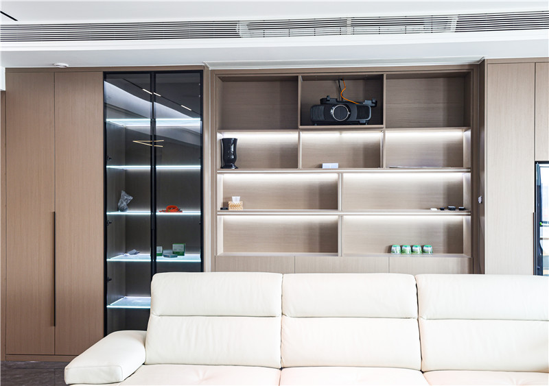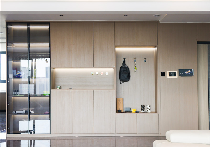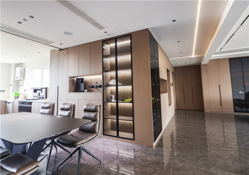 全屋選用科技直紋與莫蘭迪系列,工藝的運用凸顯木質(zhì)紋理的高檔家具材質(zhì);整體門墻柜一體化設計,視覺上和諧統(tǒng)一;藏露相宜的一柜到頂式收納柜將酒柜內(nèi)嵌,合理增加使用功能又不占空間;黑玻與燈帶的搭配在原木風基礎上增添“低調(diào)的奢華”。