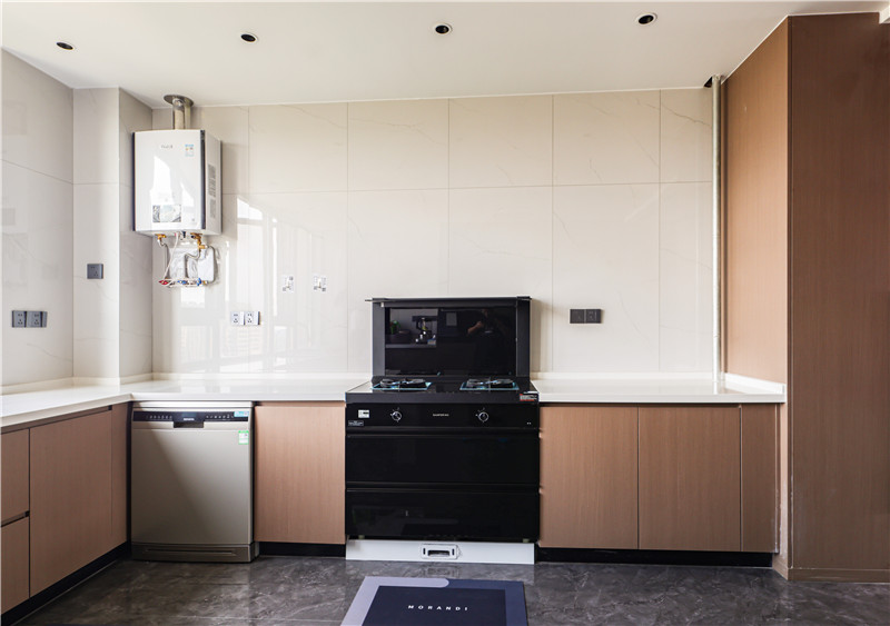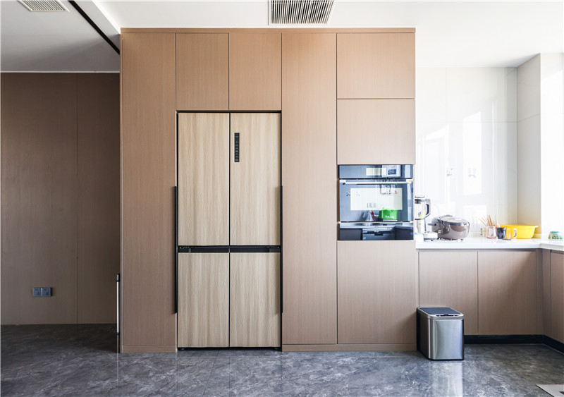 餐廚一體化設計,增強家人用餐的互動;U型設計將櫥柜與餐邊柜結(jié)合,增強收納功能;統(tǒng)一的原木風餐邊柜與櫥柜,營造柔和、舒適的感覺;原木色是溫暖明亮的顏色,用在餐廚處,打磨歲月安寧感,靜靜享受美食別有一番風味。