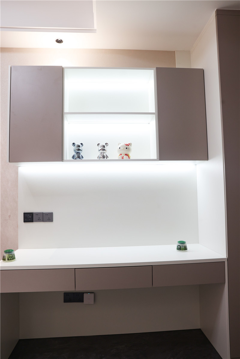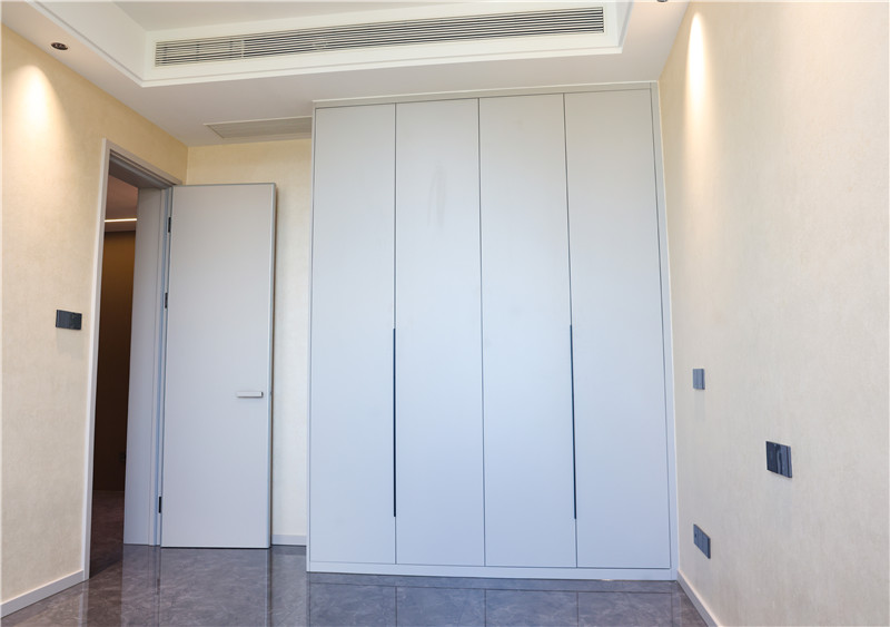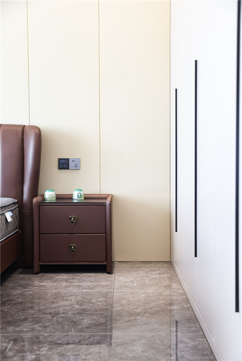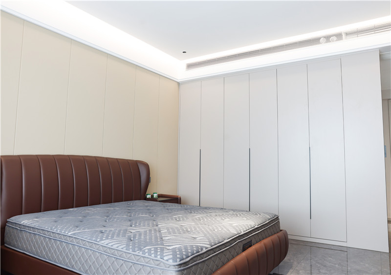 臥室簡約流暢的線條設計與低調(diào)的配色,達成屋主想要的簡單舒適氛圍;一柜到頂式與一字型長條拉手簡潔美觀,無主燈設計使空間更加干凈;部分留白讓人充滿遐想,在睡夢中遨游,感受舒適與自由。