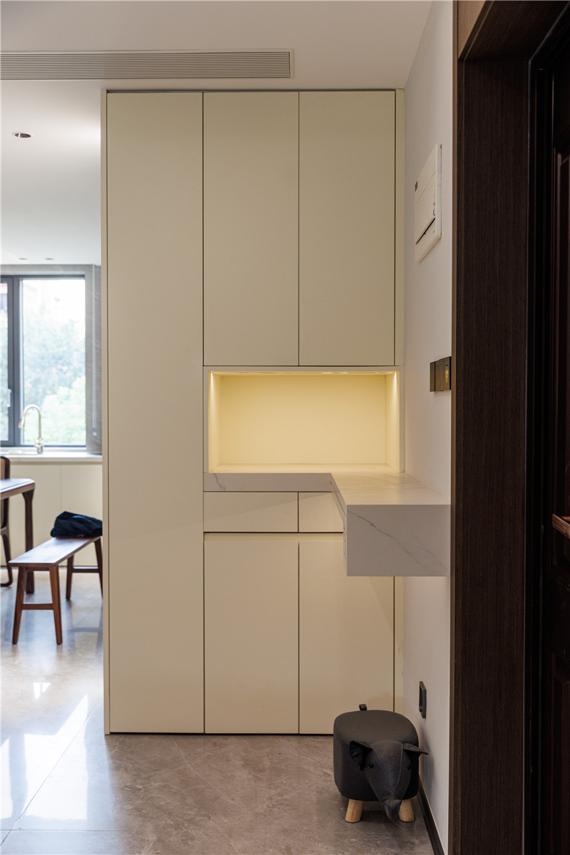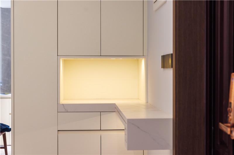 在玄關(guān)為了提升空間利用率,我們采用了嵌入式的柜體進行上下分區(qū)收納。中部掏空后延伸大理石臺面作為置物臺,放置一些小物品都很實用。