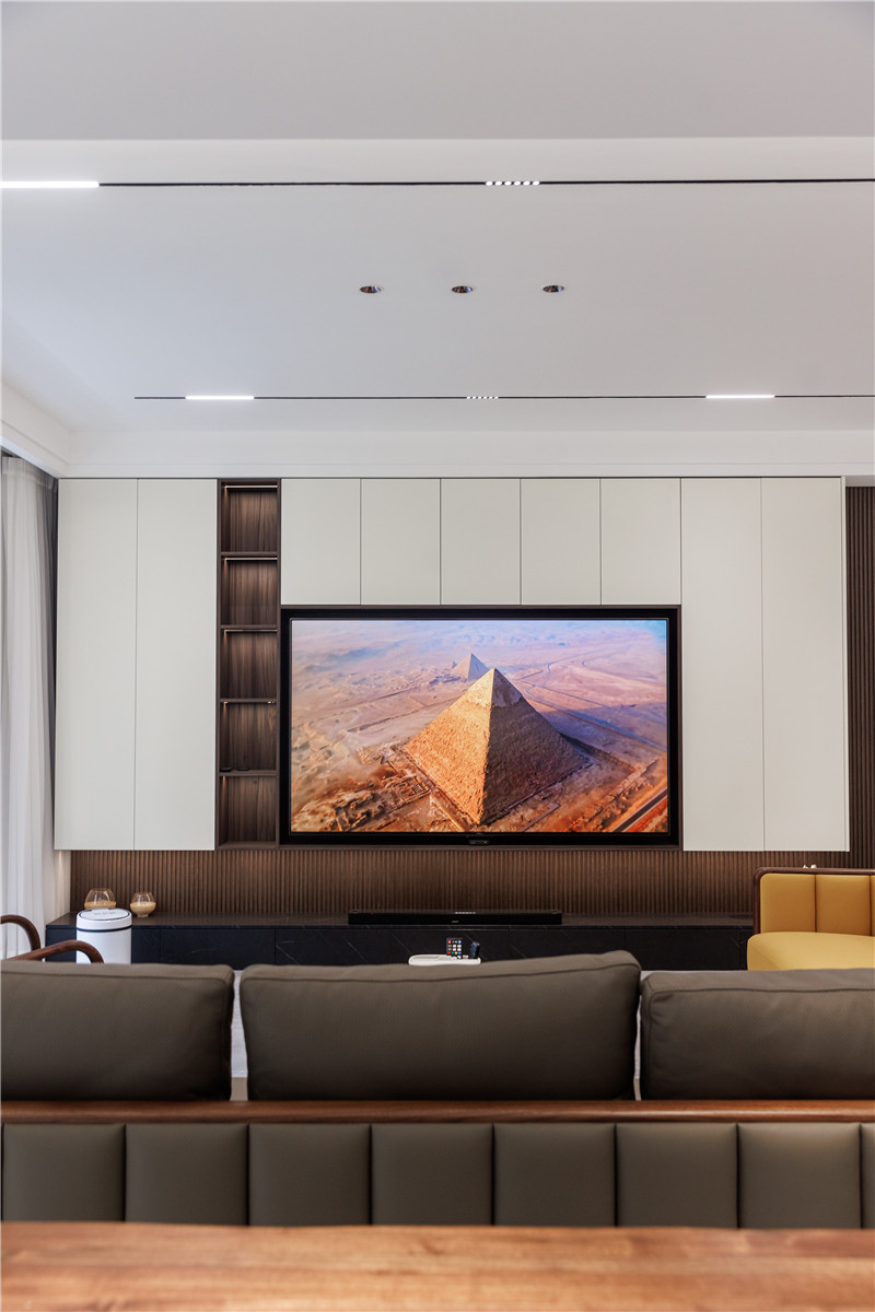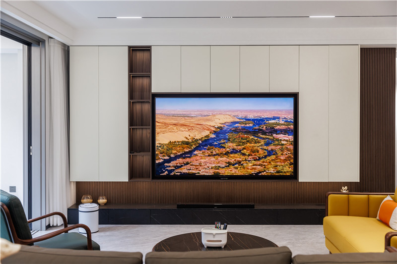圍合式的空間布局里,電視柜成為環(huán)境的主角,以納科榆木打底,再以芬蘭白柜體進行生活收納。