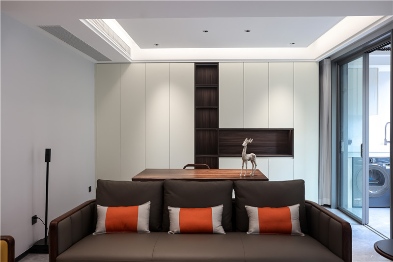 聽風吟,賞葉落。靠近的陽臺的空間里我們將其設(shè)計為一個開放休閑區(qū),無論是想在這里辦公閱讀還是做手工、喝茶都是不錯的選擇。榆木柜體的紋理清晰可見,搭配純凈的白色通頂柜,帶來一絲禪意,令人松弛神往。