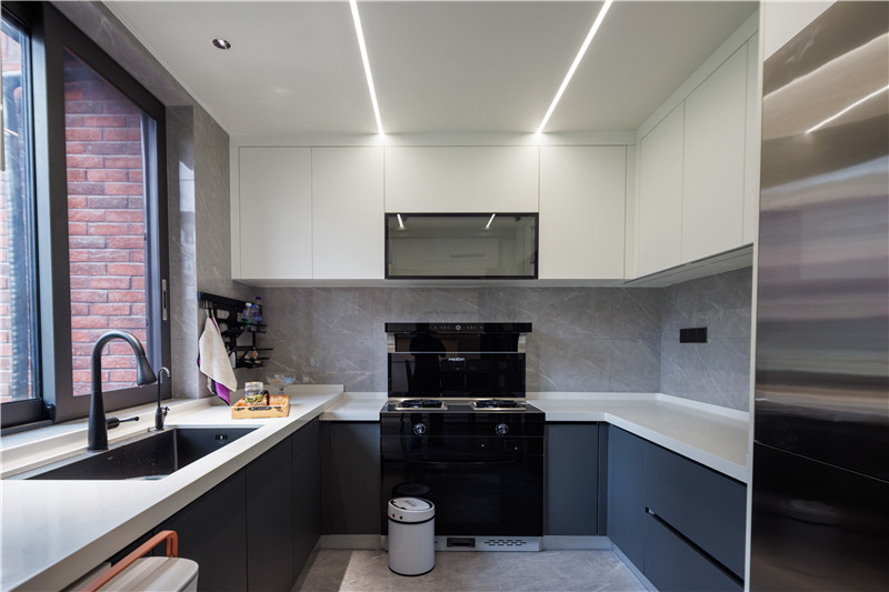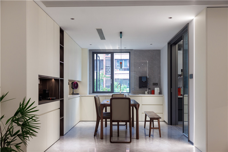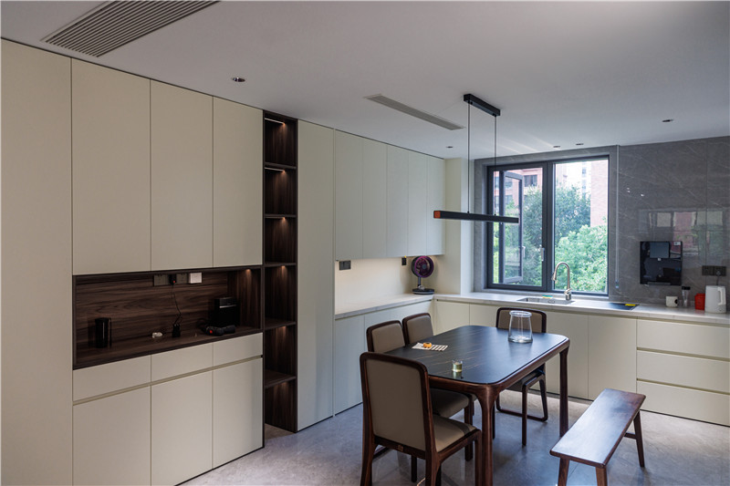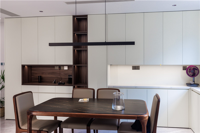 餐廚空間的設(shè)計風格與起居空間保持一致,除了傳統(tǒng)的U型封閉式中廚外,在用餐區(qū)還做了高定全屋圍合的設(shè)計。