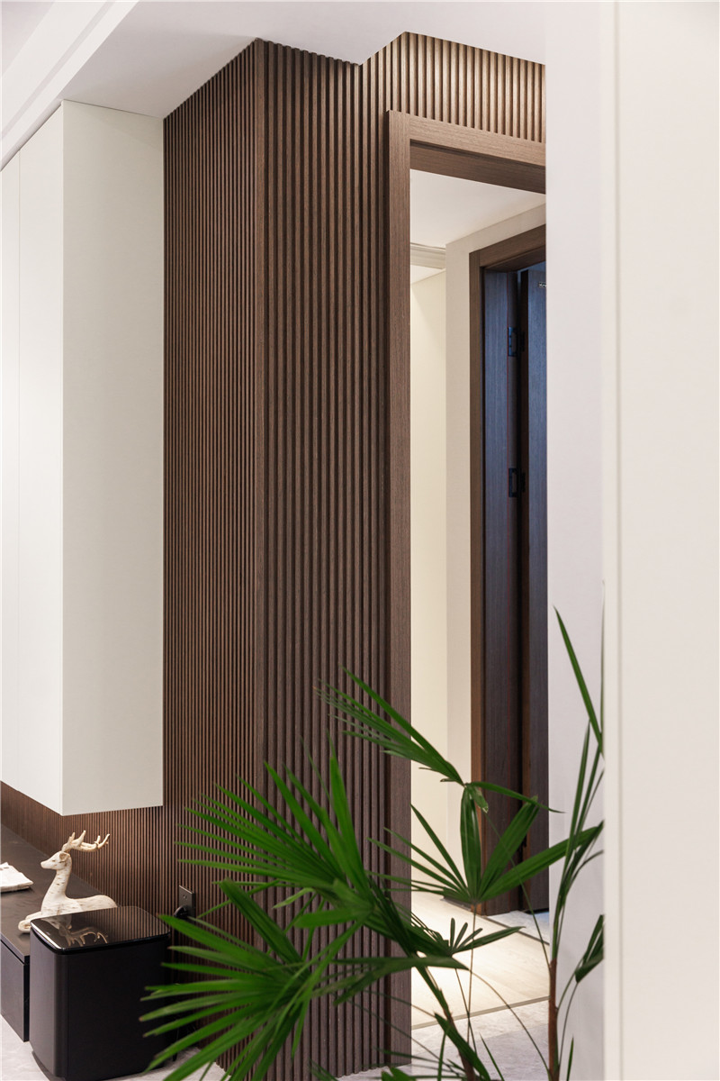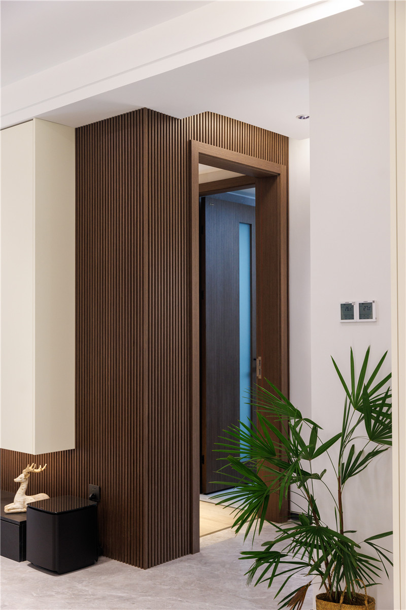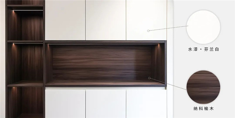 木門則采用特調(diào)的烤漆調(diào)色,與納科榆木的墻、柜形成呼應,全屋設(shè)計渾然天成,美在不言之中。