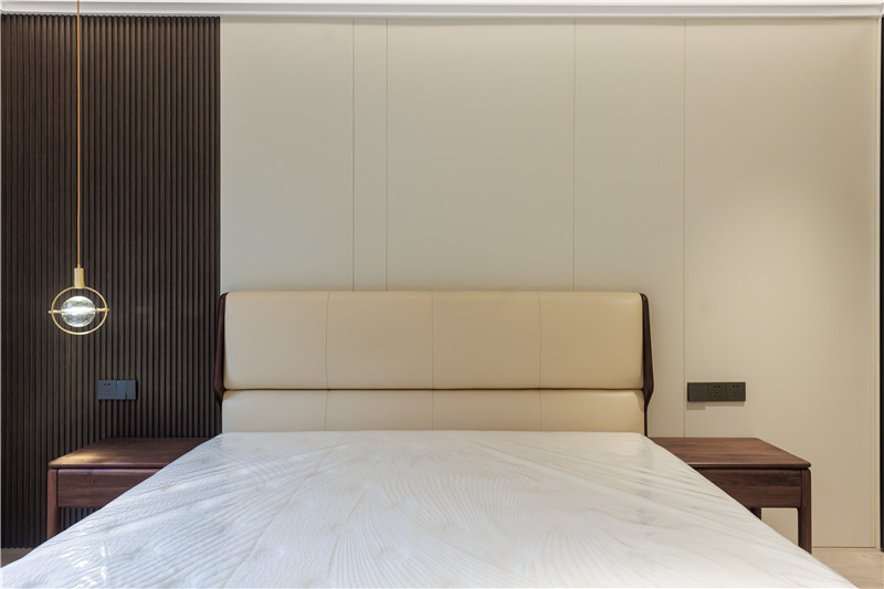 主臥的床頭背景也頗有意蘊,將拉槽墻板與格柵墻板進行拼接,增加層次感和設(shè)計感,白棕配色高級又內(nèi)斂,是追逐質(zhì)樸生活的文雅格調(diào)。
