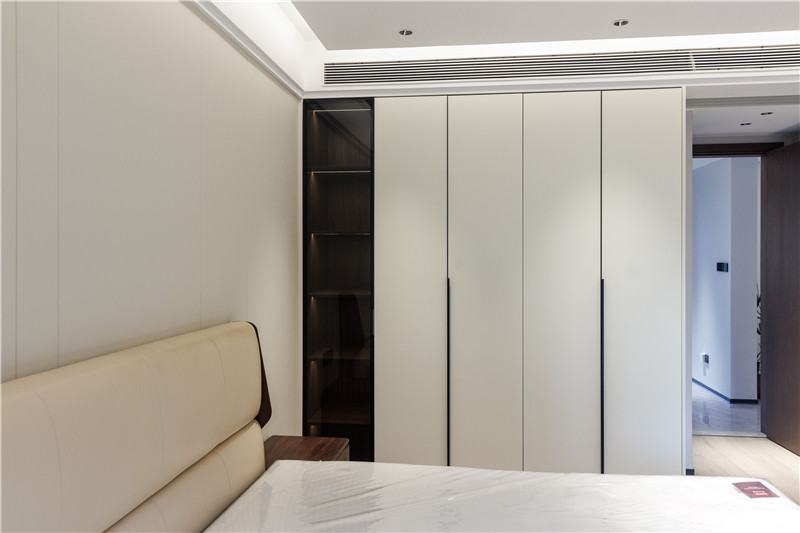 主臥空間延續(xù)一貫簡約的設(shè)計手法,注重提升家居質(zhì)感,強調(diào)人文的居住感受。自客廳格柵背景墻延伸至臥室空間,做成一體化的門套門框及門扇。