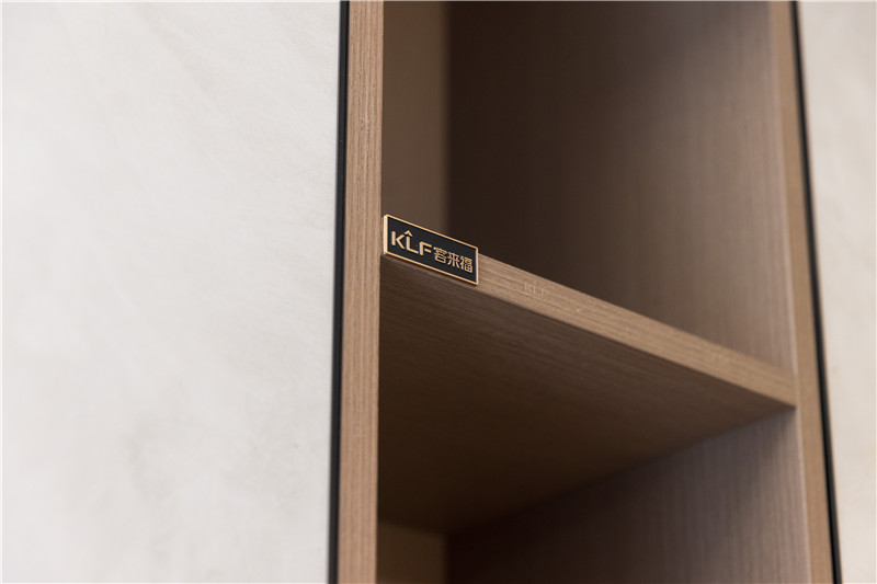 門(mén)板為楓影超晶板,亮光屬性與光影配合,為空間增色;中部預(yù)留掏空、整面窄立隔板為開(kāi)放式構(gòu)造,是小物件、裝飾物的存放地。