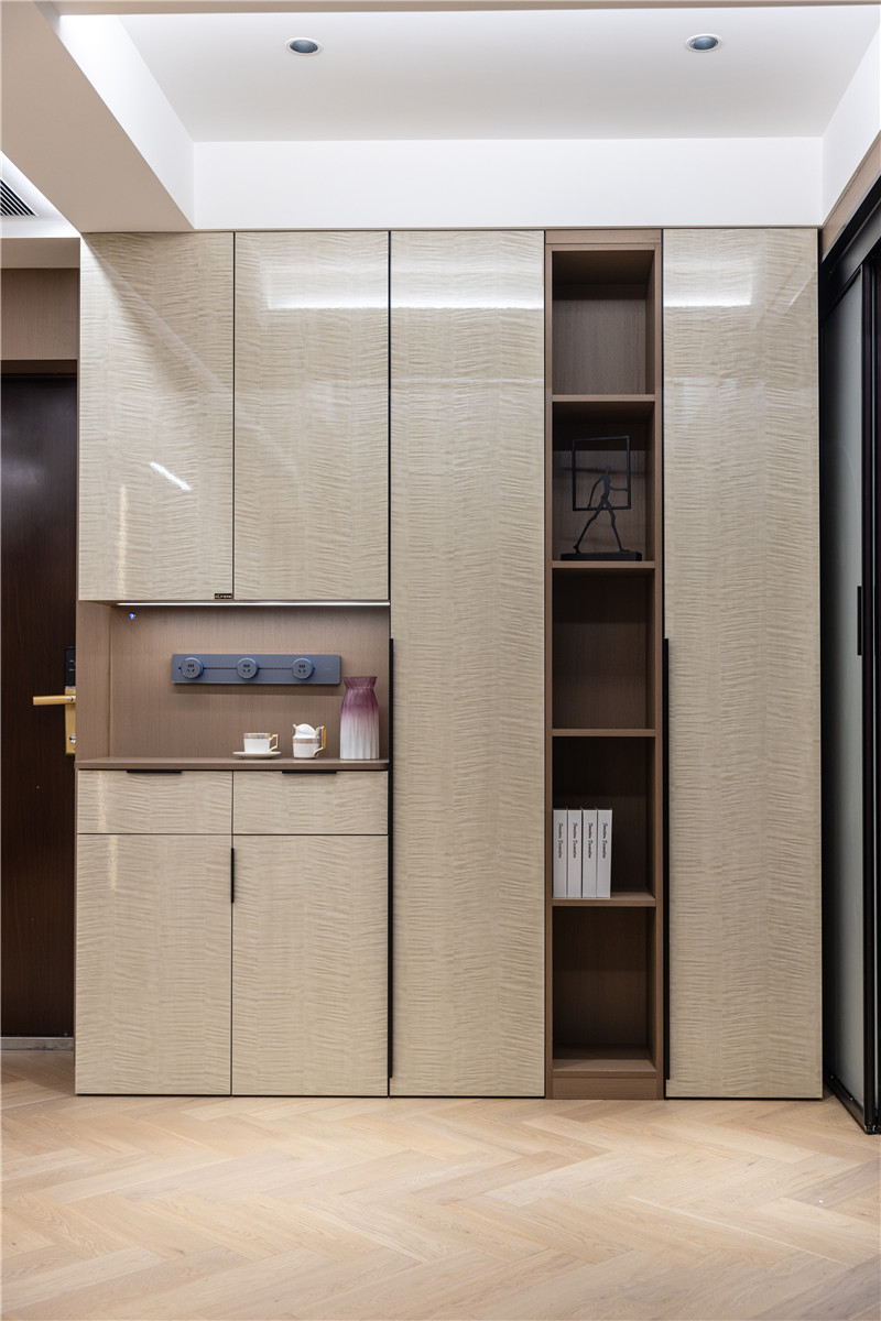 玄關(guān)柜為整面立柜,長(zhǎng)拉手、短拉手、無(wú)拉手配合,簡(jiǎn)約利落、清新雅致。