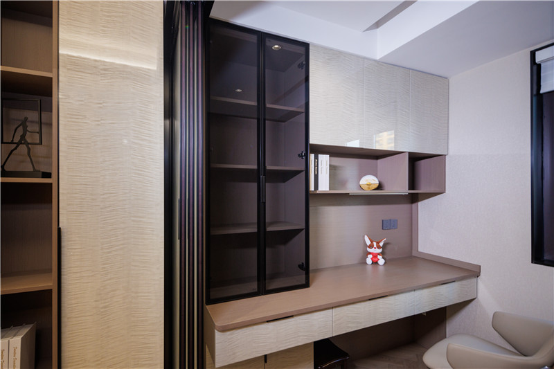書(shū)柜、玻璃柜、抽屜拉手同色,客來(lái)福黑好搭且有性?xún)r(jià)比;書(shū)桌定制高度、燈光巧妙搭配,讓學(xué)習(xí)者舒適沉浸;小書(shū)房整體協(xié)調(diào)組合,空間利用率高。
