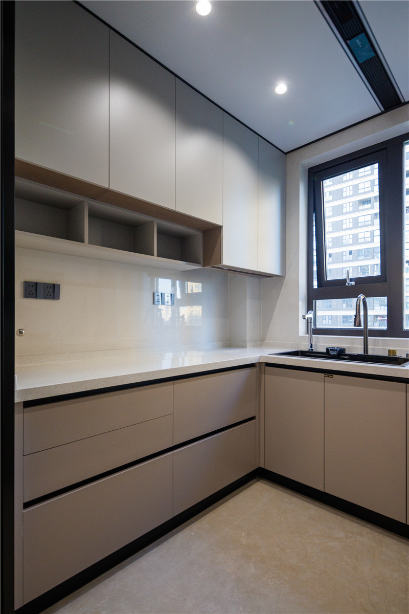 廚房柜體為科技直紋,以膚感帶給居者質(zhì)感體驗(yàn);上柜蘭迪灰搭配下柜米灰,溫潤(rùn)自然;櫥柜U型依墻而建,將烤箱電器嵌入其中,協(xié)調(diào)多物品收納的難題。