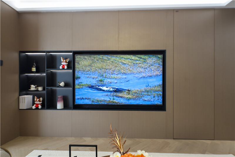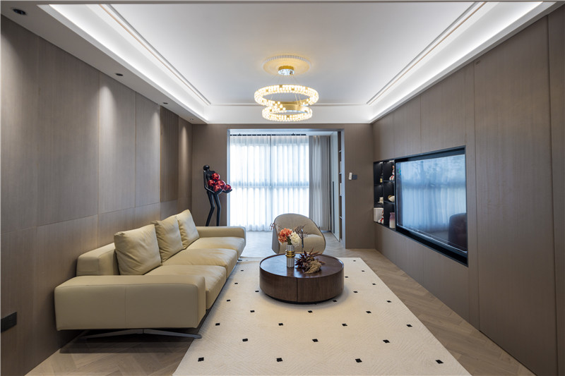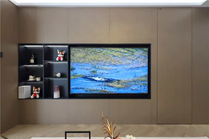 電視背景墻為科技直紋,電視機(jī)、裝飾柜深調(diào)嵌入,以視覺(jué)差突出美感;沙發(fā)背景墻科技直紋+水漆科技銀梨+柵格設(shè)計(jì)+射燈,拼接式彰顯智慧;硬裝與軟裝相輔相成,雅致大氣。