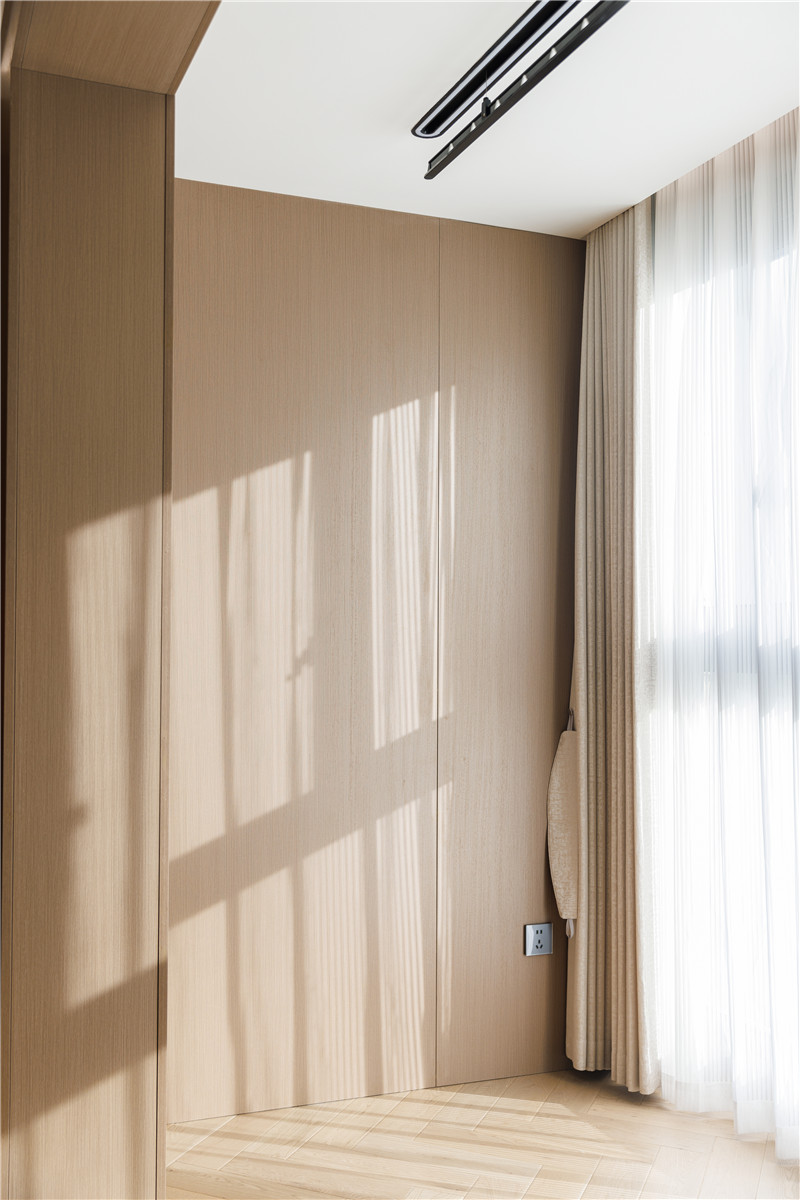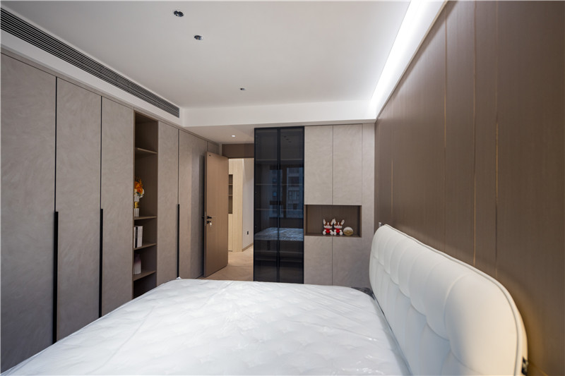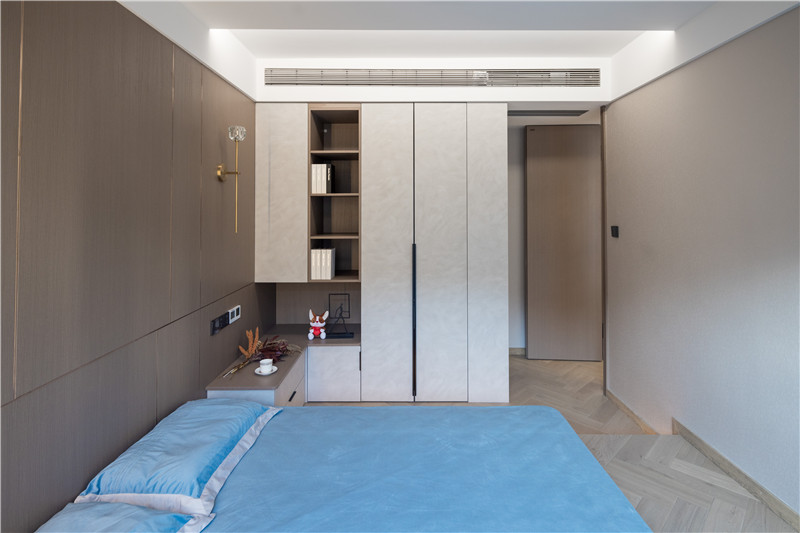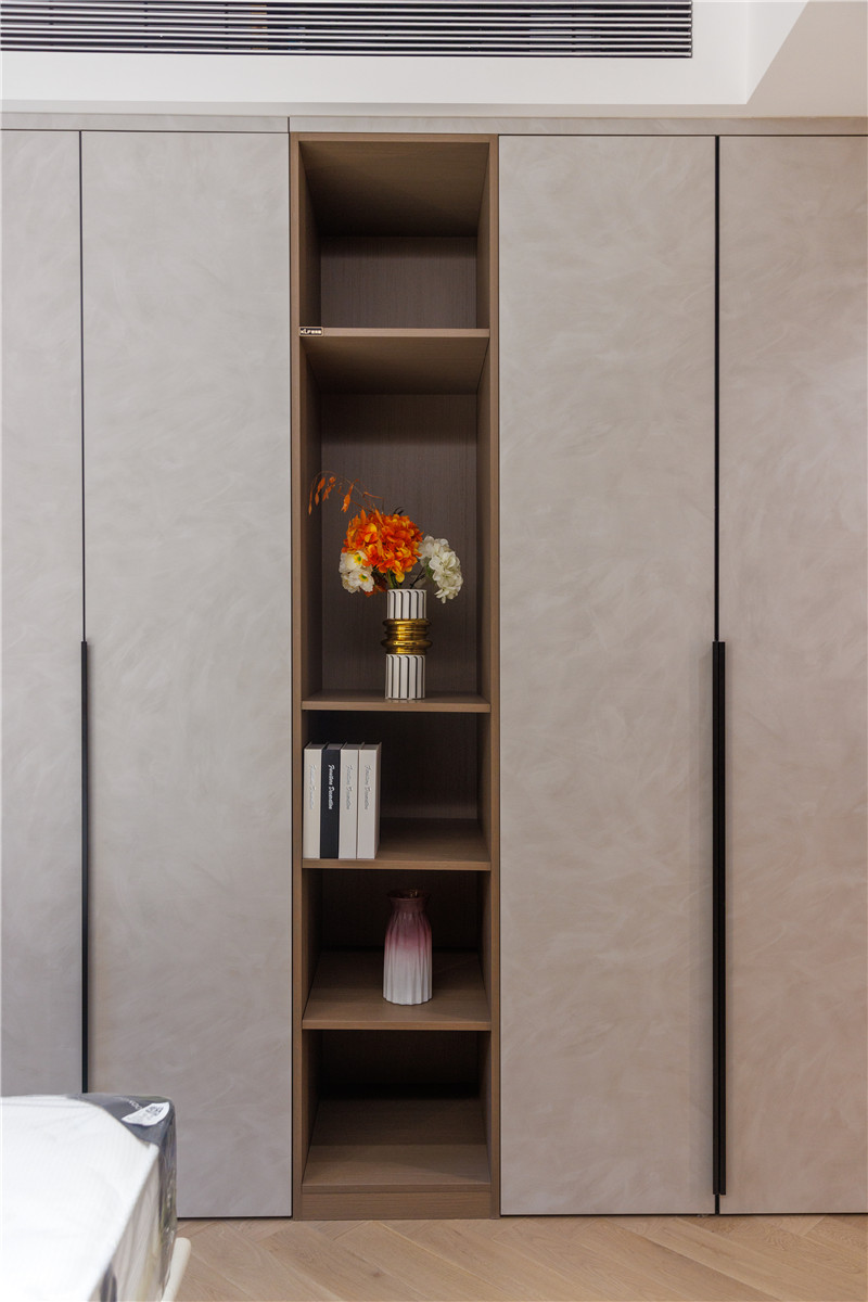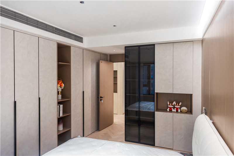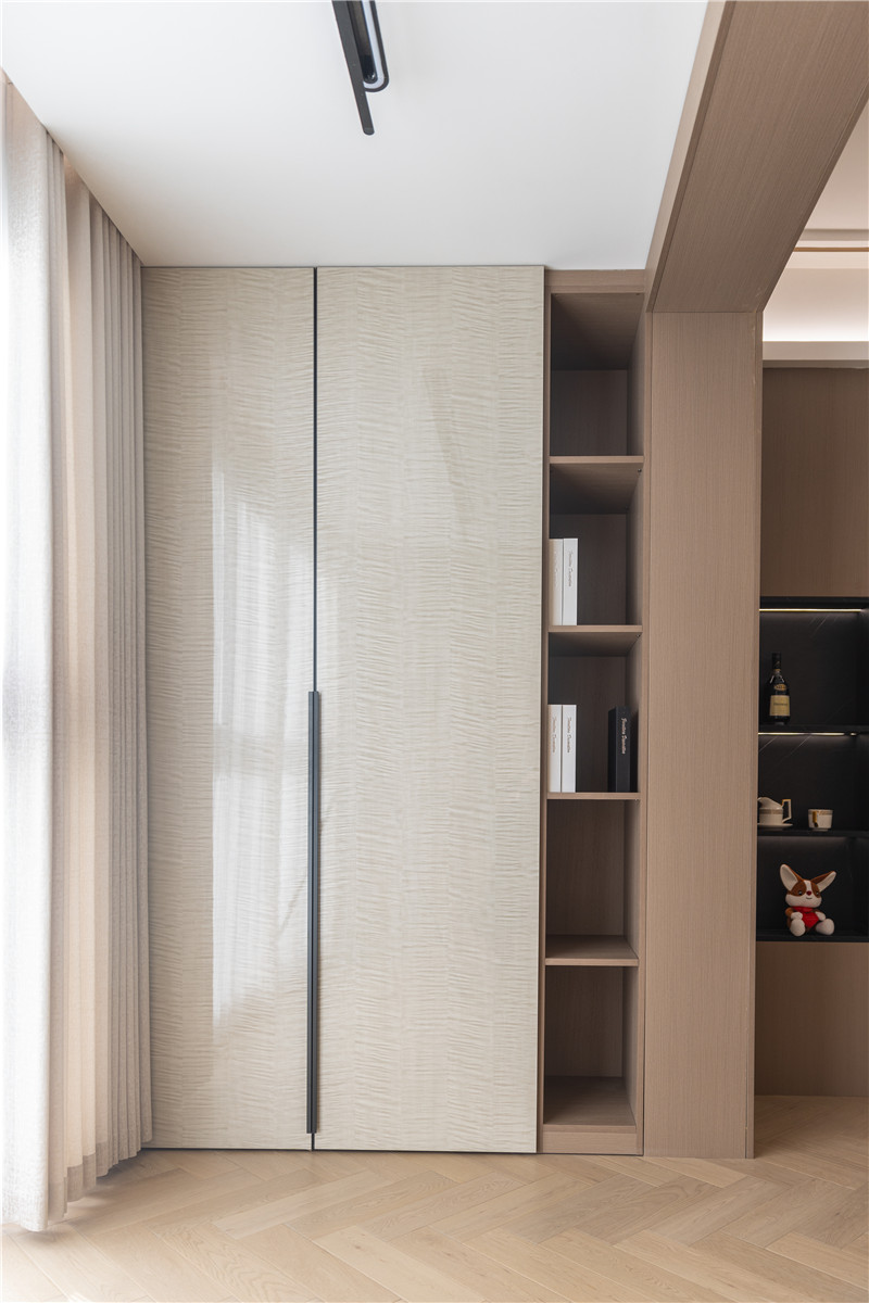 衣柜延伸以主臥的構(gòu)造,差異于延伸床頭柜,柜體科技直紋與水泥灰門(mén)板形成跳色,一體化設(shè)計(jì)和諧統(tǒng)一。