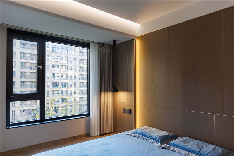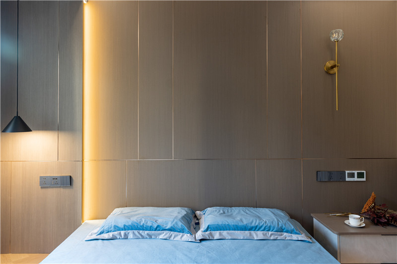 床體整體做抬高處理,下方嵌入暖系輔助燈光,格調(diào)感拉滿(mǎn);床頭整面背景墻色、光、線層次展現(xiàn),符合小資人群的審美。