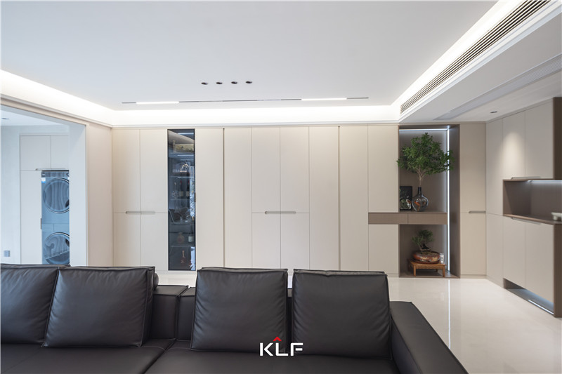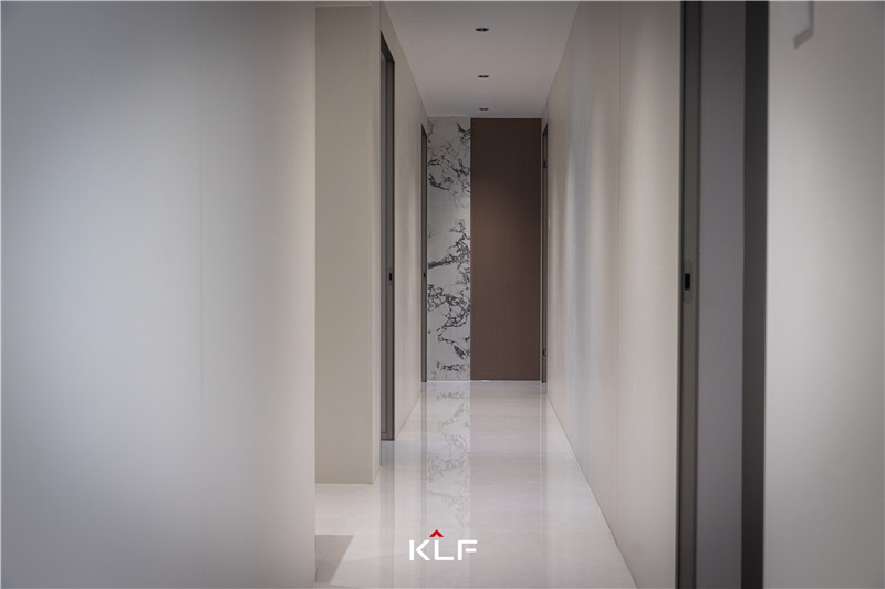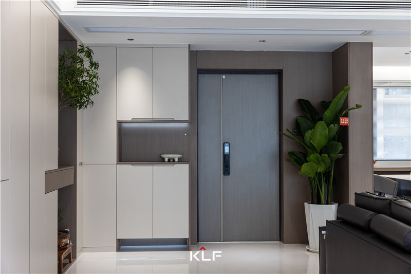 玄關(guān)中部及底部掏空,以人體工程學(xué)設(shè)計(jì)保障出入便捷度。茶白與檀木紋色彩拼接,射燈與輔助燈點(diǎn)綴局部,一整個實(shí)用住了。
