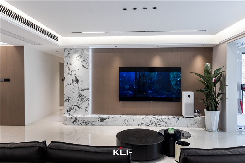 木質(zhì)電視背景墻邊圍以大理石紋磚做突出,沙發(fā)背景墻整面立柜設(shè)計(jì),玻璃柜、木質(zhì)柜做拼接,以穿插設(shè)計(jì)、拉手造型做個性化,彰顯美感。