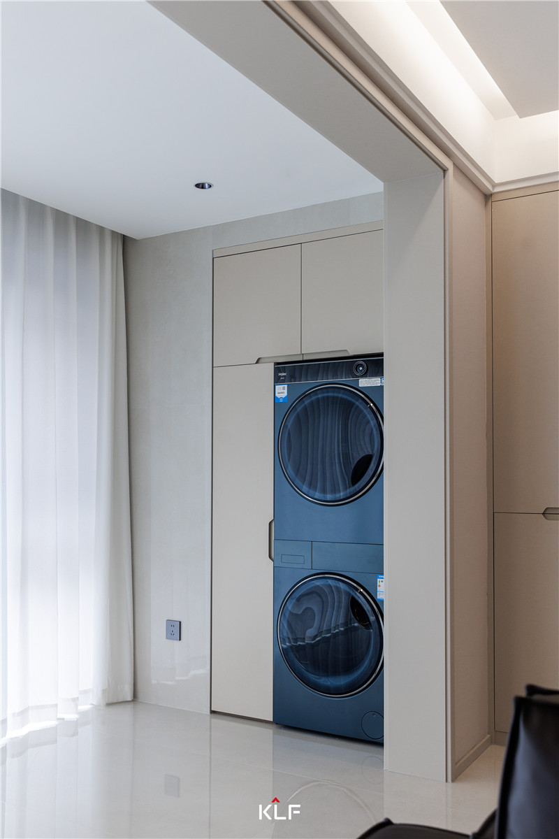 陽臺洗烘一體式洗衣房,整體與沙發(fā)背景墻相協(xié)調(diào),分散家里的洗漱壓力。