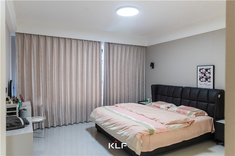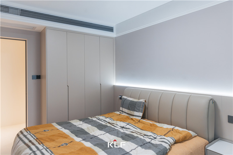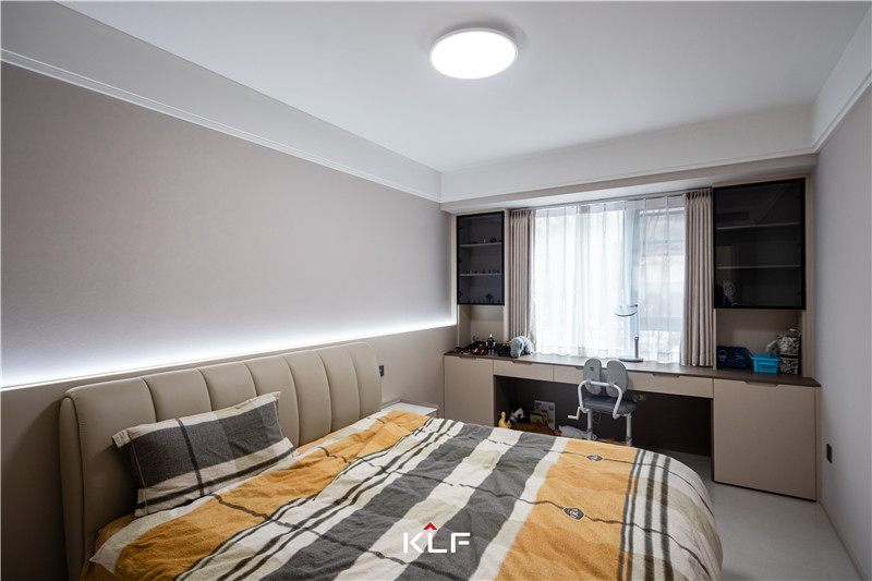 主臥以茶白調(diào)盡顯柔和溫潤。入門到頂式立柜協(xié)調(diào)拼接式床頭板、銑槽長拉手不占空間,靠窗建立小型書柜,靈活性強(qiáng)。