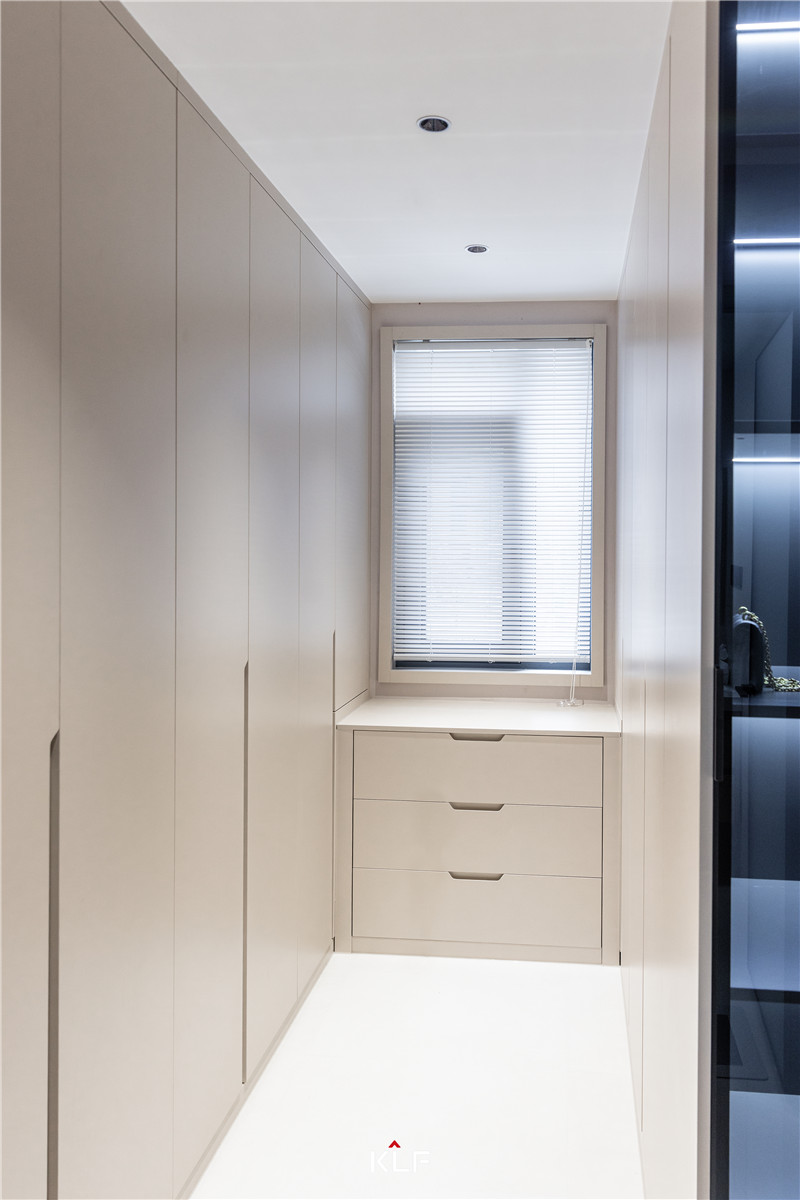 家里的狹長區(qū)域不知道怎么利用?不妨做成獨(dú)立式小型衣帽間。衣柜呈U型構(gòu)造,抽屜與立柜相組合,是家里的多功能房,分散存儲收納壓力。