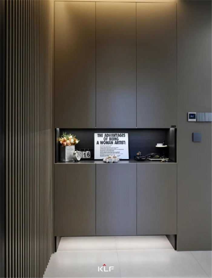 入戶玄關(guān),以內(nèi)斂精致的設(shè)計風(fēng)格,流露出新貴奢感,彰顯現(xiàn)代意式的平衡之美。靜謐的灰融化于玄關(guān)柜,啞光質(zhì)感低調(diào)奢華,黑胡桃木背板內(nèi)斂大氣,搭配線條感十足的木格柵,層次豐富的材質(zhì)拼接,流露出藝術(shù)氣息與都市風(fēng)尚。