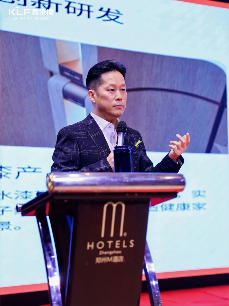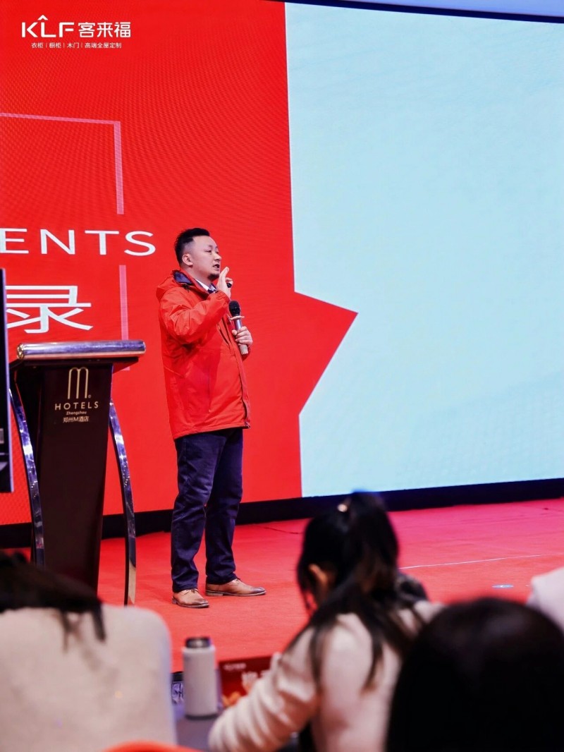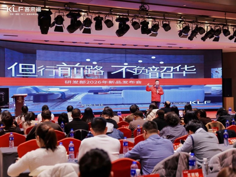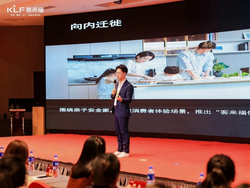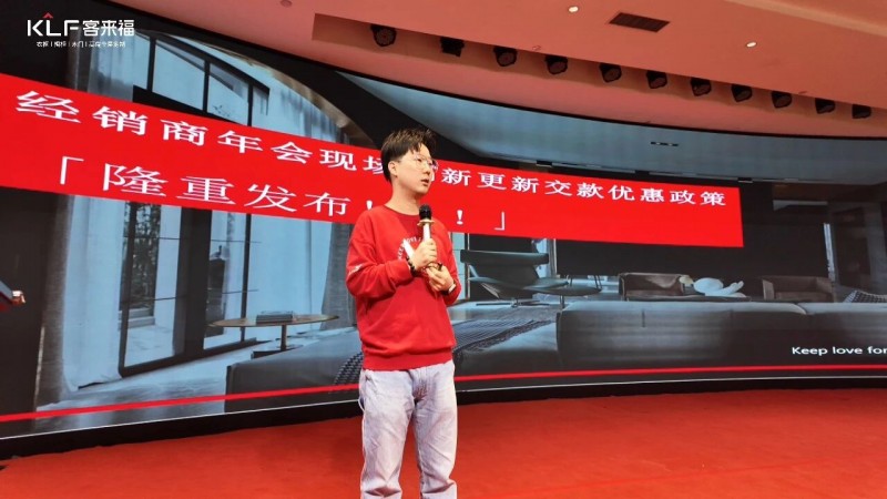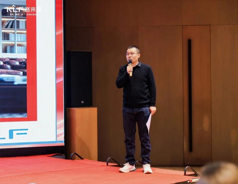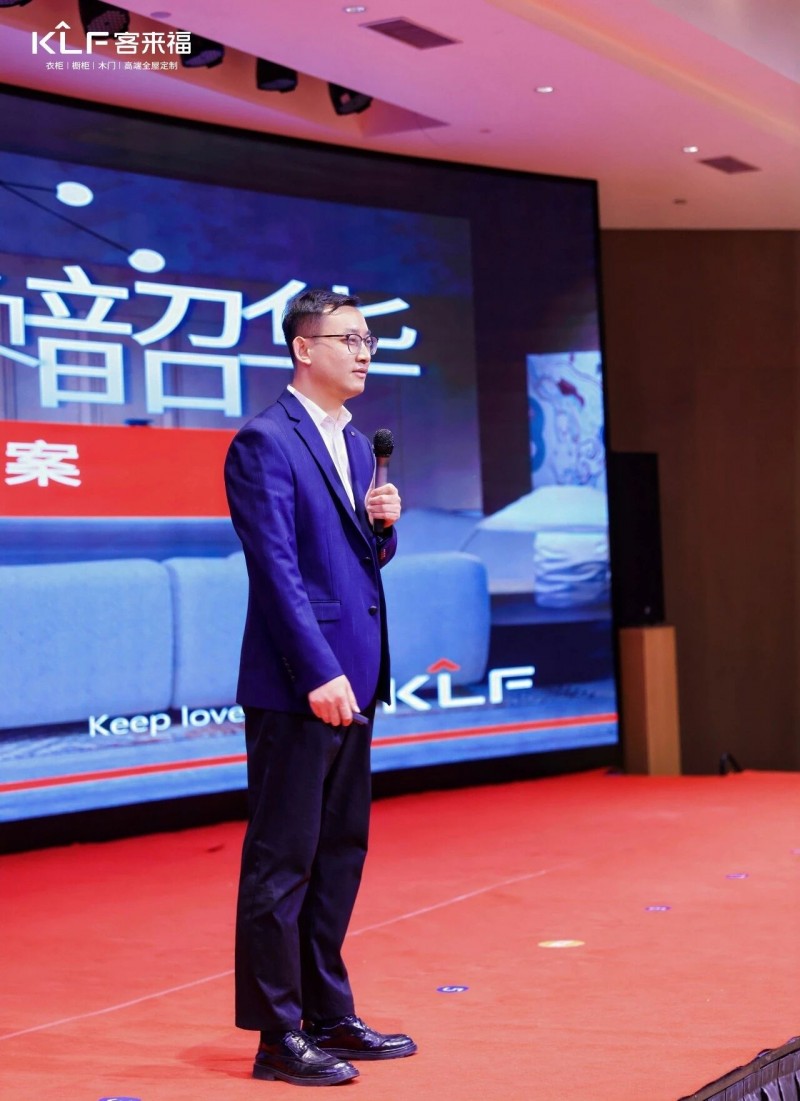 在熱烈的掌聲中,客來福商研部研發(fā)總監(jiān)劉云輝先生登臺(tái),為全場經(jīng)銷商帶來了2026年度新品深度解析。從核心板材五金到前沿色彩搭配,再到整體空間解決方案,系統(tǒng)闡述了新品的競爭優(yōu)勢與匠心設(shè)計(jì)。干貨滿滿的分享,令在座合作伙伴對年度新品矩陣與市場前景有了清晰認(rèn)知,信心倍增。