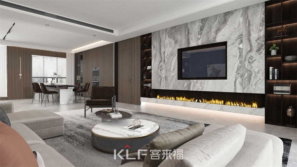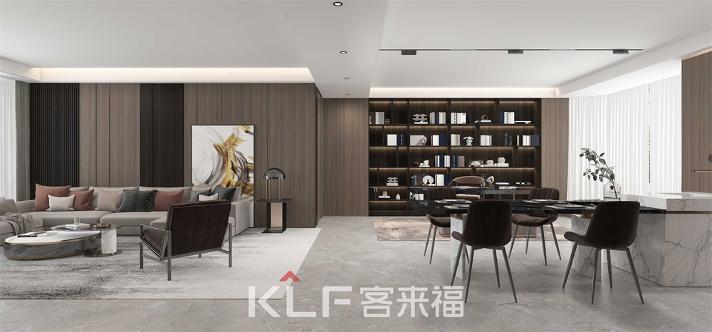 深咖色與木紋的巧妙結(jié)合,令客餐廳更顯沉穩(wěn)大氣。頂天立地柜的嵌入式與半開(kāi)放式設(shè)計(jì),空間立體感油然而生。三兩親朋相聚洽談,保證輕奢格調(diào)的同時(shí)滿足你的多樣化需求。