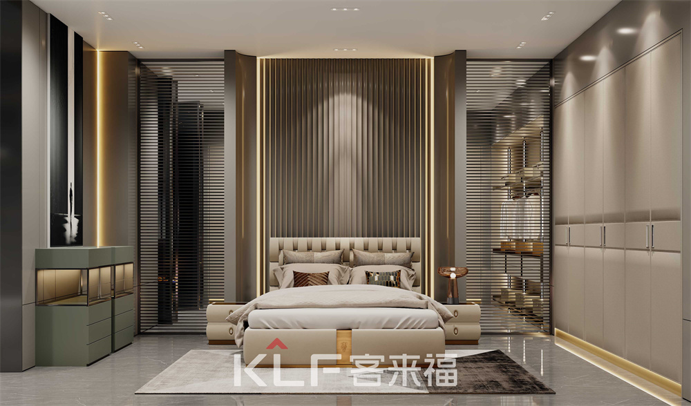 作為修養(yǎng)身心的家庭空間,墨奈系列臥室背景采用莫蘭迪水漆波浪板,造型低調(diào)又不失活潑,完美呈現(xiàn)出溫馨氛圍。搭配上意大利鋁包邊的大地色皮革門,彰顯出輕奢的生活態(tài)度,奢而不華,重在細節(jié)。