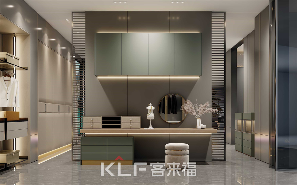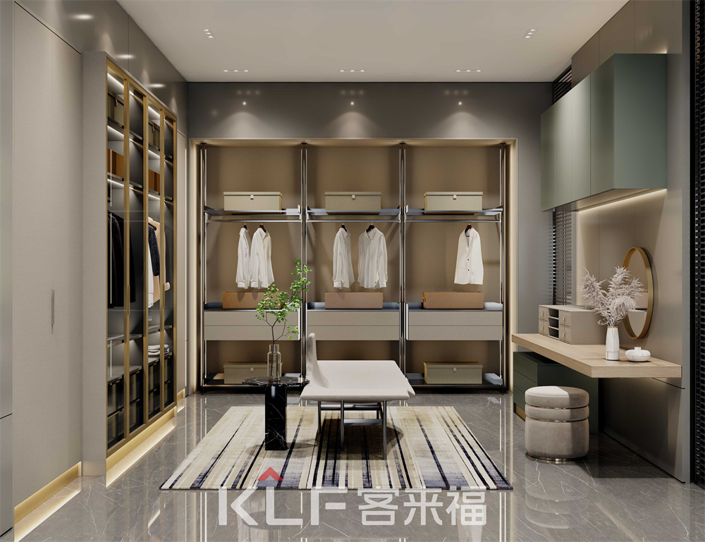 衣帽間里藏了生活的儀式感!墨奈系列衣帽間中間采用全透明的天地鉸鏈門,精美的展現(xiàn)出內(nèi)里衣物,同時還能防塵。側邊柔杏色梳妝臺搭配觀看死角的氛圍條帶燈,讓衣帽間整體梳妝一體,打造出優(yōu)雅環(huán)境。