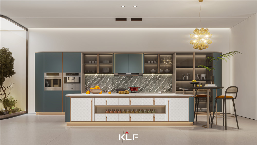 圓弧元素貫穿空間,線(xiàn)條顯溫柔之美。整面定制櫥柜以鳶尾藍(lán)為主色調(diào),羅馬柱、嵌入燈光的運(yùn)用,勾勒出高級(jí)奢感;島臺(tái)整體呈橢圓形,島臺(tái)柜門(mén)采用客來(lái)福IP皮革雕刻工藝,顏值在線(xiàn);珊瑚白柜門(mén)與魚(yú)肚白臺(tái)面相呼應(yīng),顏色更具層次感。