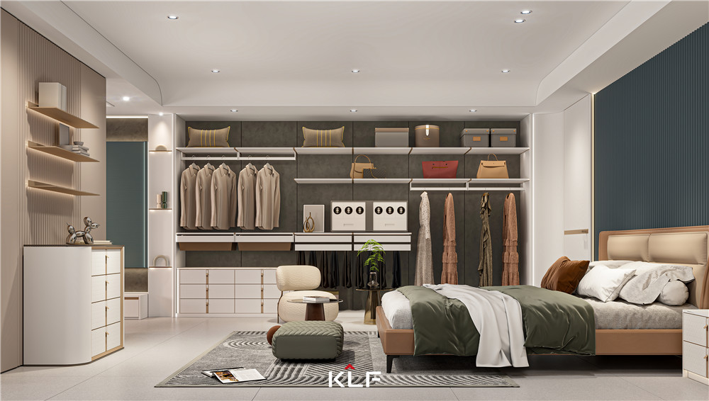 臥室背景板應(yīng)用了極光白的S弧形護(hù)墻板+菱形格+圓弧波浪板,凹凸有致,以光影感成就空間藝術(shù)感;床頭柜沿用IP雕刻門(mén)板+兩側(cè)圓弧設(shè)計(jì),讓小床頭柜也頗具特色;衣柜采用懸掛系統(tǒng),整體敞開(kāi)式布局增強(qiáng)空間通透感。
