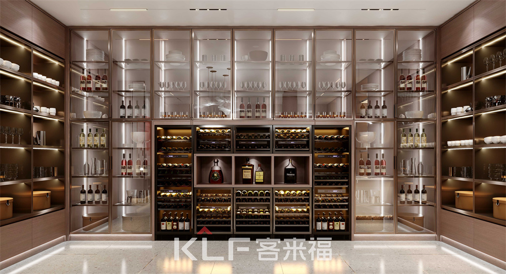 中式酒窖采用了對(duì)稱設(shè)計(jì),左右開放柜,中間運(yùn)用全透明超白玻型材玻璃門,讓酒窖的高端不可言語(yǔ),彰顯出主人對(duì)酒品的熱愛(ài),對(duì)生活的自由向往。